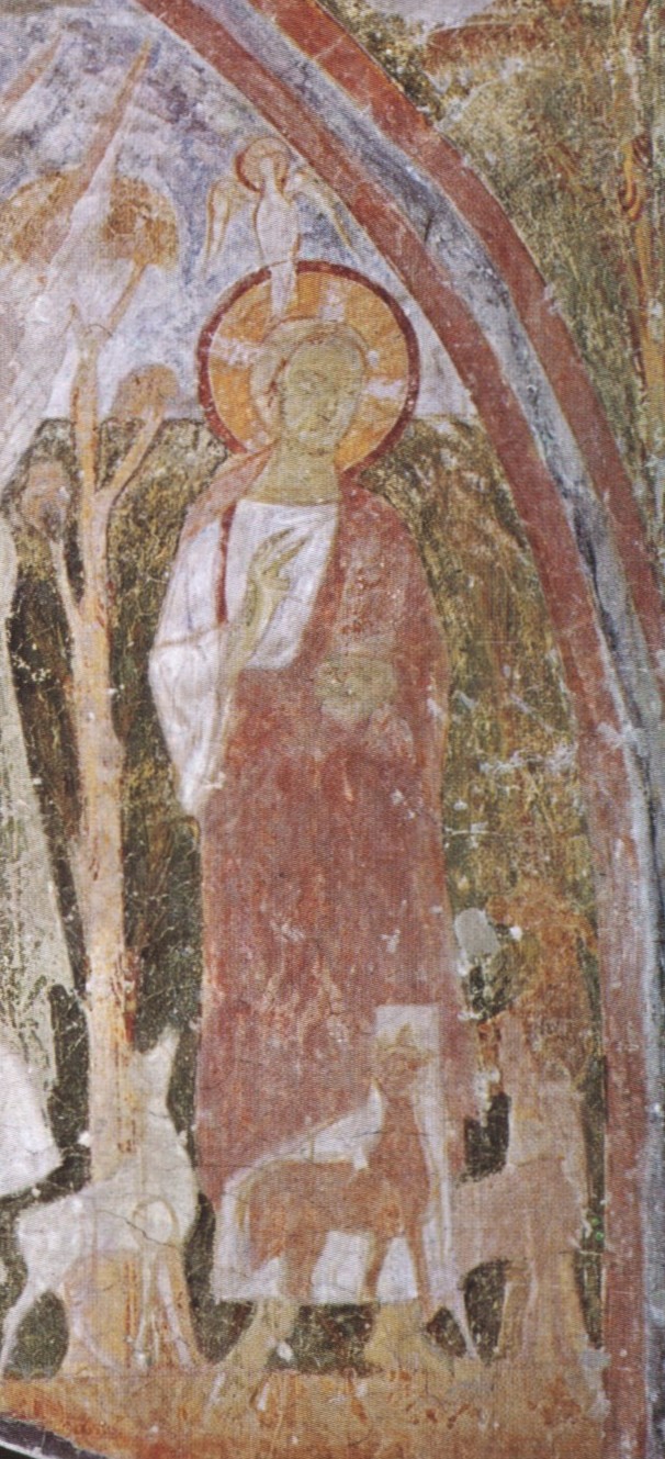 Widzimy Go jako Dobrego Pasterza z czterema owcami. Nad Jego głową