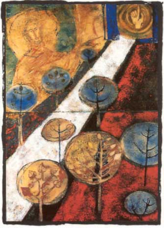 Kolory złoty i niebieski symbolizują życie w niebie, jako cel człowieka