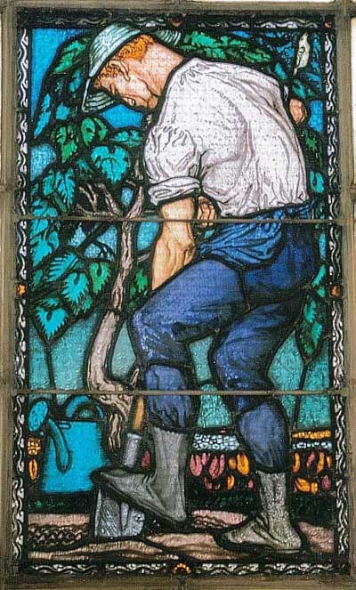 Seitenfenster, das den Arbeiter im Weinberg darstellt.