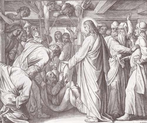 mężczyzn w nietypowy sposób i przez otwór w dachu złożony przed Jezusem.