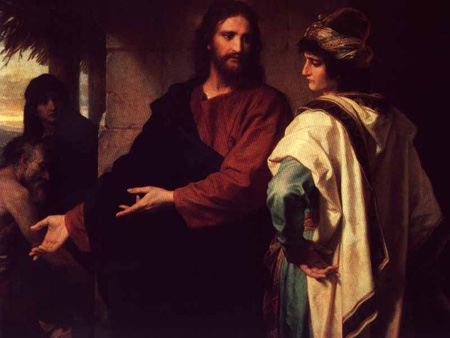 Eine Darstellung Jesu mit dem reichen Mann bietet das Bild von Heinrich
