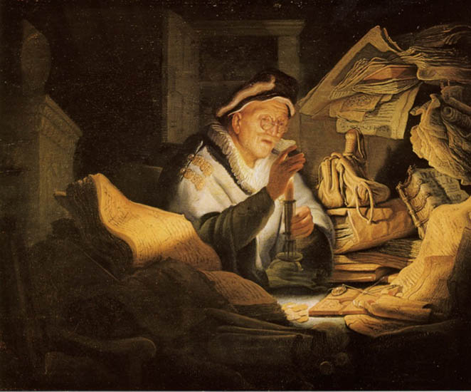 złote monety. Chciwość nie daje mu nawet nocą spokoju. Przyszedł on do swojego biurka z zapaloną świecą,