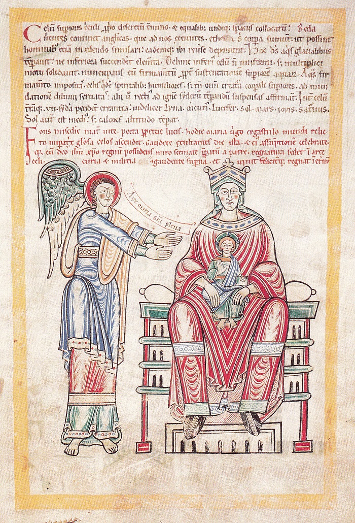 Dziecię. Banderola unosi się w stronę Maryi z napisem: Ave
